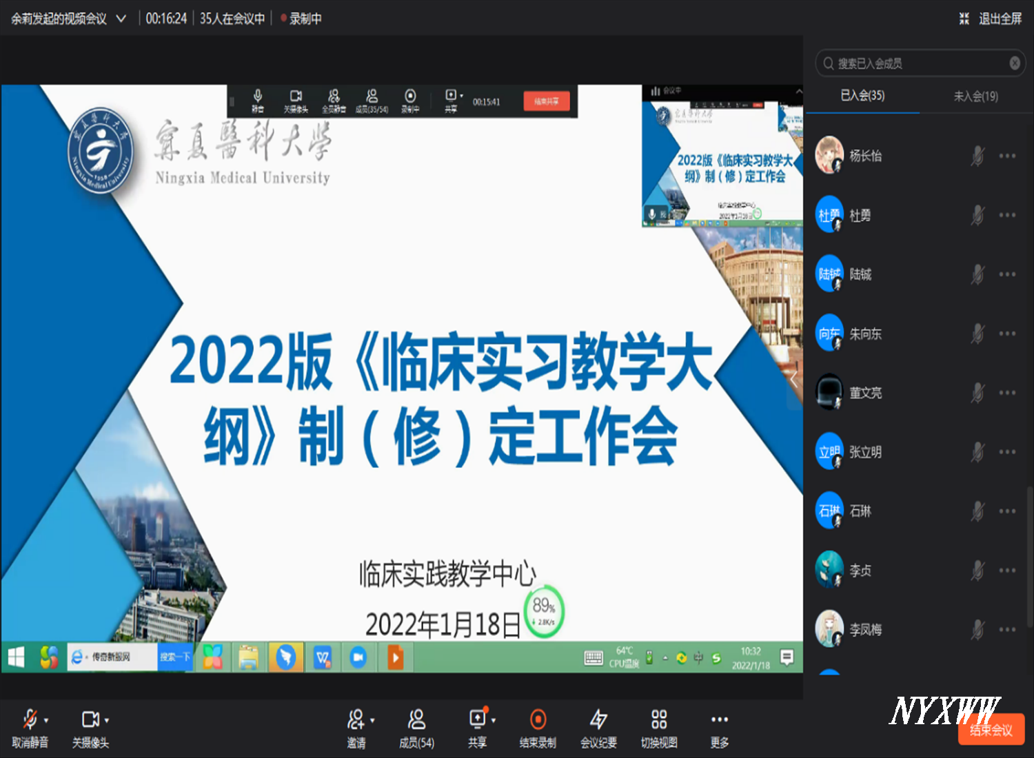 1月18日,临床实践教学中心以线上视频方式组织召开了2022版《临床实习教学大纲》及《实习考核与鉴定手册》制(修)订工作会,学校副校长杜勇出席会议,教务处、临床医学院、中医学院、口腔医学院、药学院、护理学...