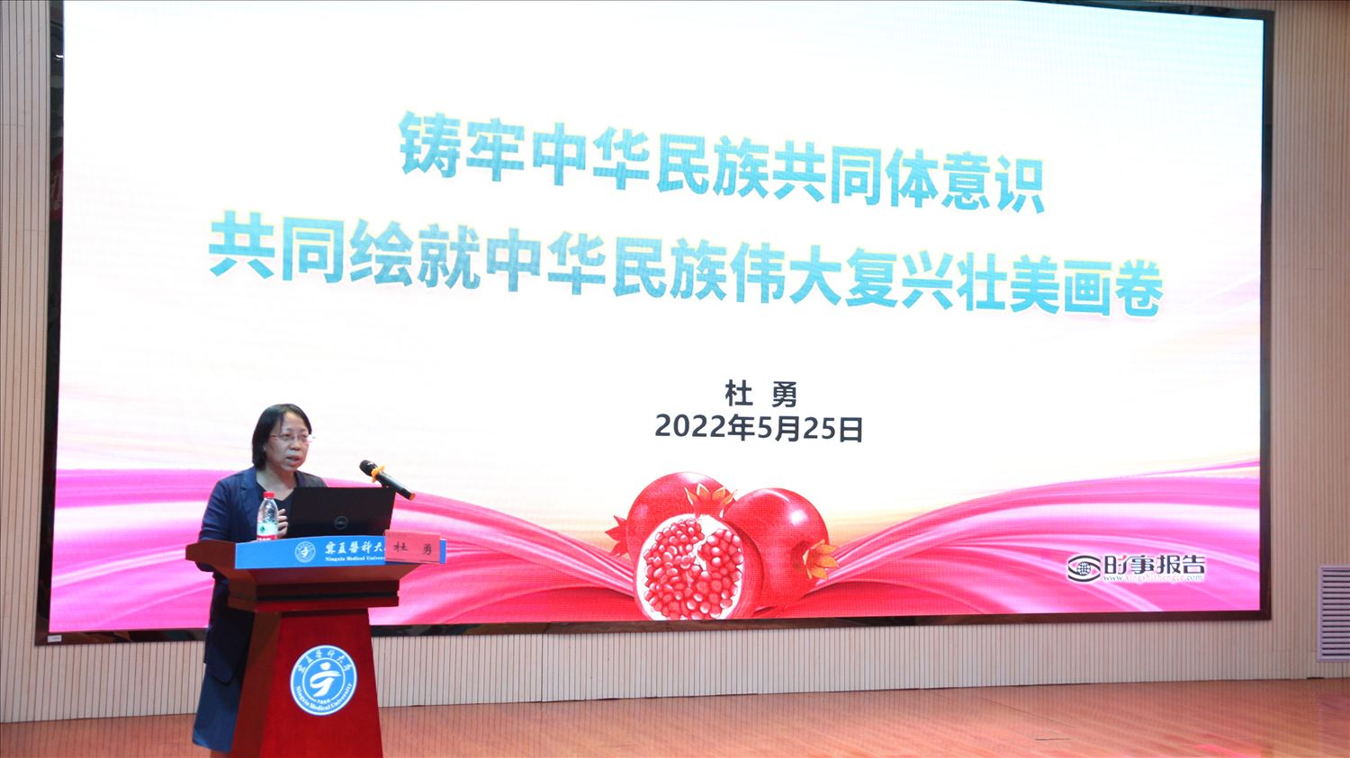 5月25日下午,学校副校长杜勇在应谦教学楼启思学术报告厅以“铸牢中华民族共同体意识 共同绘就中华民族伟大复兴壮美画卷”为主题为2021级中医卓越班、中医班、中医学(全科方向)班讲授形式政策课。 杜勇运用大...