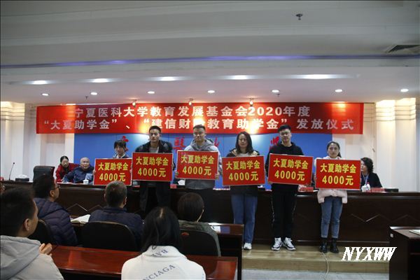 11月26日下午,学校教育基金会在正德楼101会议室举行“大夏助学金”“建信财险教育助学金”发放仪式。学校校长孙涛、党委副书记朱建华、教育发展基金会理事长张建中、关心下一代工作委员会“五老”专家代表滕京教授、建信财产保险有限公司宁夏分公司总经理王佳莉,学校相关单位负责人,教师代表及受助学生代表参加了仪式。仪式由学校副校长郝银菊主持。