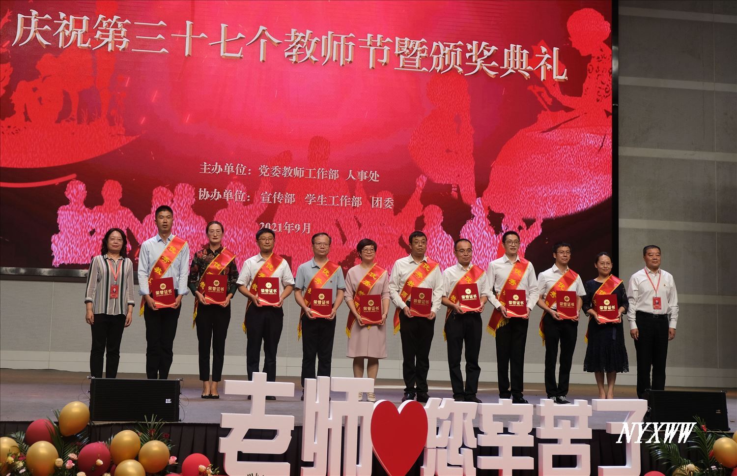 校领导分别为本年度“教书育人楷模”“优秀教师”“优秀教育工作者”等奖项获奖代表颁奖。获奖代表深情演唱歌曲《长大后我就成了你》,诠释了甘于奉献的高尚师德和责任担当。学校退休教师、校友纷纷发来祝福视频,会场内掌声不时响起,气氛热烈。