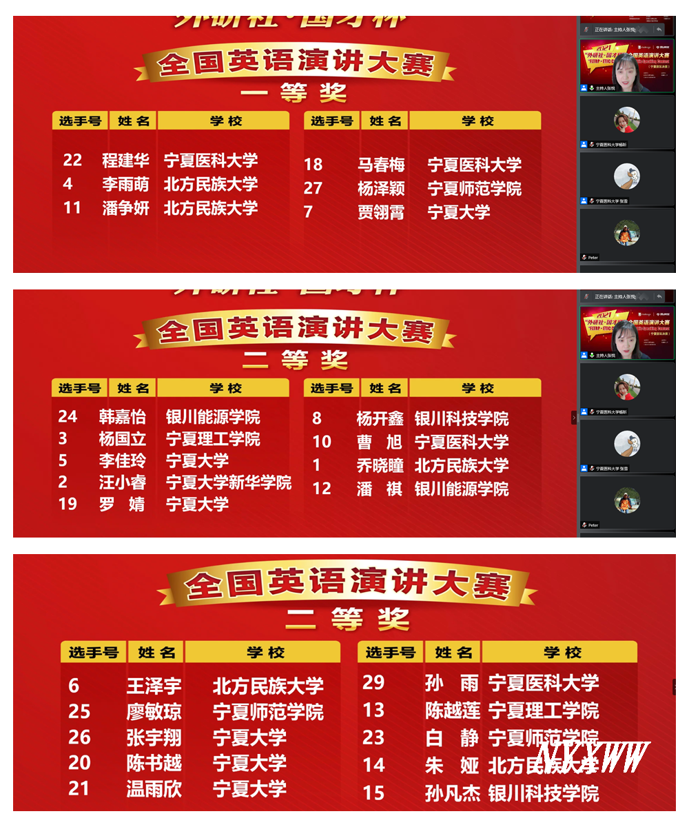 受“疫情”影响,此次写作、阅读与演讲大赛由线下转为线上,是宁夏地区首次采用线上模式举办三项赛事。为使大赛顺利举办,力求远程赛事的公正公平,学校外国语教学部全体教职工克服重重困难,上下齐心努力攻克技术难关,对三项赛事的具体细节进行反复讨论和演练,与各高校指导教师、参赛选手积极沟通,频繁互动,确保大赛直播画质清晰标准。经过一天的激烈角逐,在来自宁夏大学、伟德国际1946源于英国、北方民族大学、宁夏师范学院等高校外国语学院的专家、教授组成的评委会公平公正的评判下,大赛于下午6点30分圆满落幕。