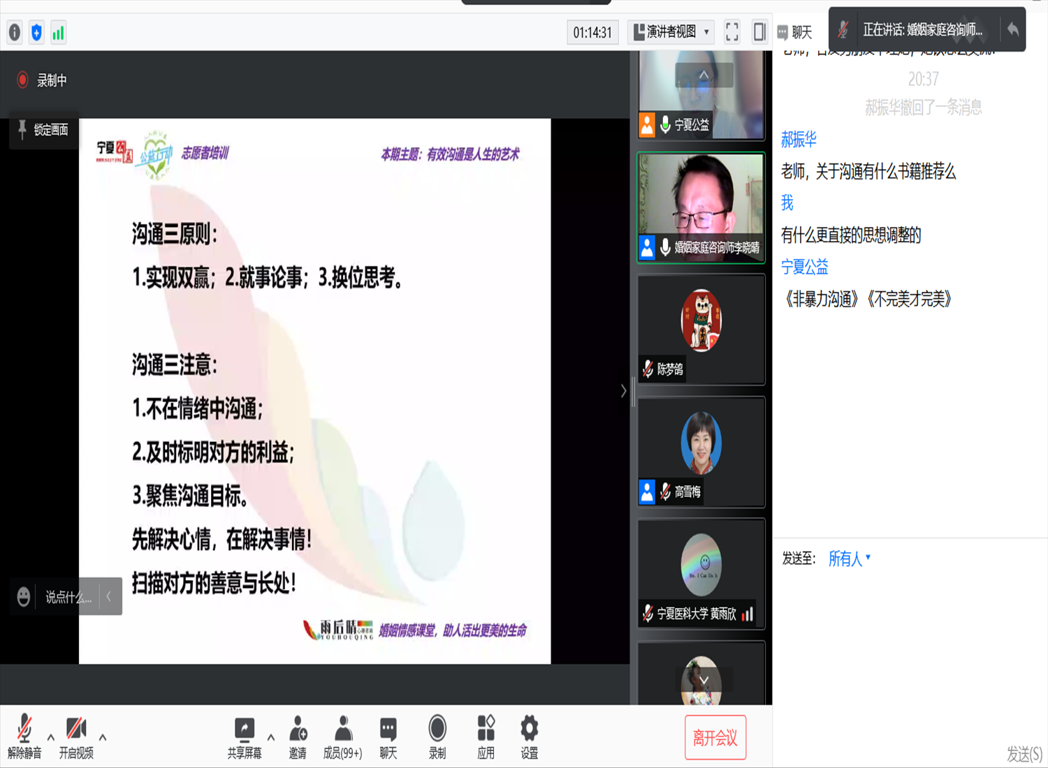 12日,宁夏精神卫生中心精神科主任医师徐卫国以“有效应对学业压力,健康生活每一天”为题,分别向博士和硕士作了专题讲座。徐主任通过对校园生活中常见的心理健康问题进行讲解,帮助同学们理解心理健康的内涵,正确看待事物,科学管理情绪,积极锻炼意志,培养良好的人格,有效预防心理问题。13日,国家二级婚姻家庭咨询师李晓晴通过线上直播公益课的形式,作了题为“有效沟通是人生的艺术——别让无效沟通影响你的效率和情绪”的讲座。李老师从“沟通”的定义、实现有效沟通的方式方法、沟通中的基本原则与注意事项等方面,引导大家了解和正确使用沟通艺术,学习沟通的技巧,提高人际交往能力和学习效率。
