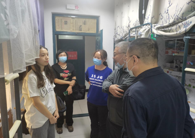 在学校医务室,朱建华详细了解近期学生就诊情况,现场办公解决医务室缺少药品等实际困难,同时也代表学校向在一线值班的同志表示慰问。在走访学生宿舍时,详细了解了学生被确定为次密接者的原因和在宿舍自我隔离期间的学习、生活状况,与学生进行了亲切交流。谢波代表学校感谢同学能够积极遵守上级部门疫情防控要求,主动配合学校的疫情防控工作,同时也向同宿舍人员转达了上级防疫部门对两名同学解除隔离健康安全返回宿舍的通知,希望大家要相互放心、相互关心,及时与刚刚返回宿舍的同学开展一对一的学习、生活帮扶。