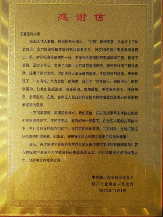 自“9·20”宁夏疫情发生以来,公共卫生与管理学院接到自治区和学校关于支援流调工作通知后快速响应,学院师生积极主动请战,先后分三批前往吴忠市、银川市金凤区和贺兰县参加新冠肺炎流行病学调查志愿服务工作。团队累计拨打流调电话近6.5万余分钟,完成确诊、密接、次密接追溯电话1.5万人次,参与流调溯源培训、经典案例传播链条分析研讨会若干次,协助当地疾控中心完成全部阳性病例流调报告、下发通知百余份,现场流调、消毒指导及督导若干次。第一时间高质量完成流调溯源工作,得到当地政府和相关部门的高度赞扬和充分肯定,展现了“艰苦奋斗无私奉献”的宁医精神和公卫人特别能吃苦、特别能战斗的风采。