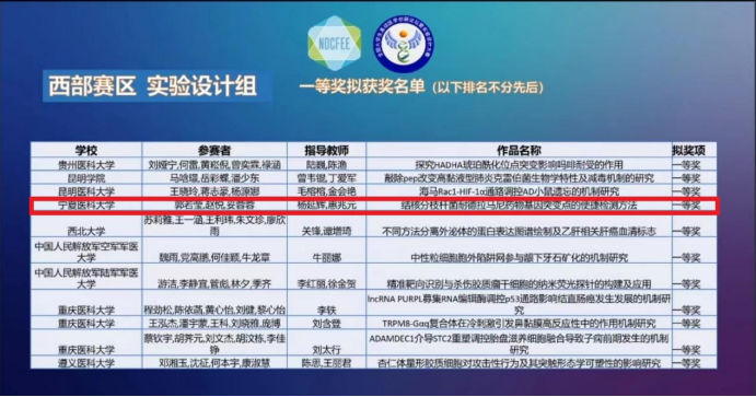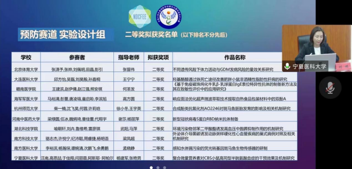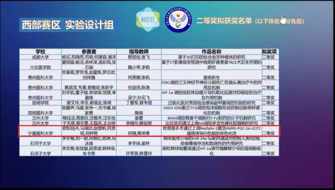 复赛中,伟德选派12支代表队参加本次复赛,经过两天线上的激烈角逐,曹相玫、常越老师指导的英叶霞团队项目荣获西部赛区创新研究组一等奖,杨延辉、惠兆元老师指导的郭若莹团队项目荣获西部赛区实验设计组一等奖,何瑞、黑常春老师指导的欧阳佳卉团队荣获西部赛区实验设计组二等奖,杨建军,张艳男老师指导的汪南团队荣获预防医学赛道实验设计组二等奖。