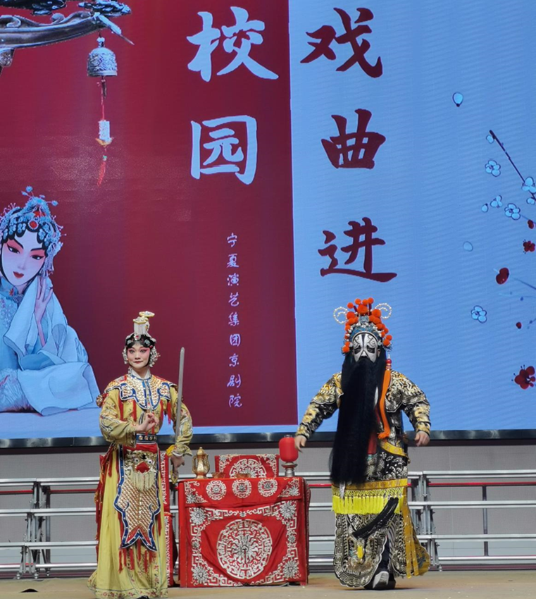 活动中,来自宁夏演艺集团京剧院的艺术家们详细介绍了京剧“唱、念、做、打”的艺术表演程式,在与学生互动式演出的过程中全面讲解了京剧中的“生、旦、净、丑”四大角色的艺术内涵,倾情演绎了《贵妃醉酒》《红高粱》《变脸》《霸王别姬》等国粹京剧的经典曲目,为师生呈送了一场集文化知识传播和艺术欣赏为一体的中华优秀传统文化盛宴。