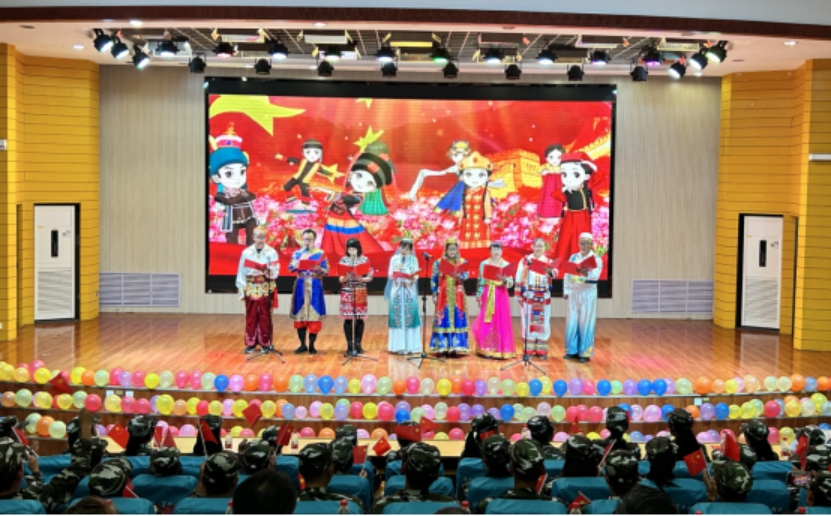 文艺汇演由合唱《民族一家亲》、诗朗诵《青春中国》、大合唱《强军战歌》《我的中国心》《中国,中国,鲜红的太阳永不落》《再唱山歌给党听》,舞蹈串烧组成。互动环节中,师生共同进行了民族团结知识答题。