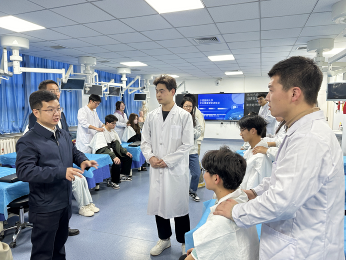 在调研针灸推拿协会社员培训活动时,协会负责人向调研组简要介绍了协会发展历程、工作情况、取得成果及未来规划。龚雪飞肯定了社团的各项工作,他鼓励协会成员要继续努力学习中医传统疗法,勤加练习推拿、扎针技术,通过“社区实践计划”、暑期“三下乡”社会实践等形式,积极走出校园开展中医科普宣传、健康义诊咨询,为弘扬中医药传统文化、服务广大人民群众生命安全和身体健康贡献青春力量。