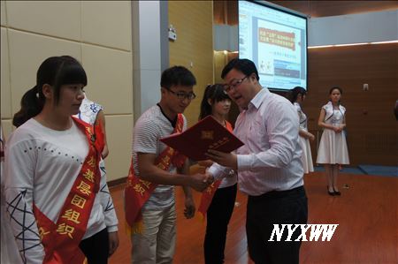 自治区团委副书记丁聃为“五四”红旗团支部颁奖