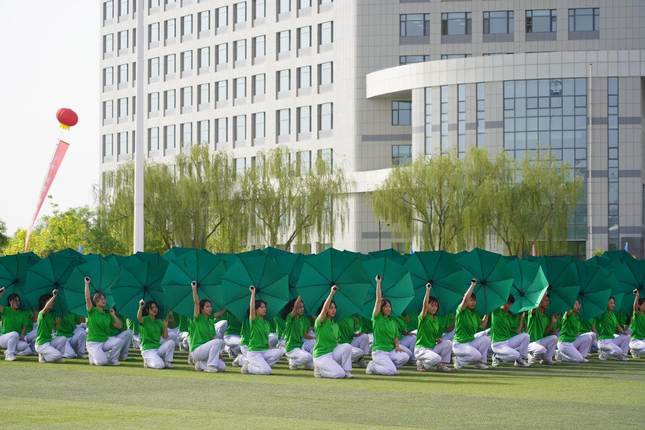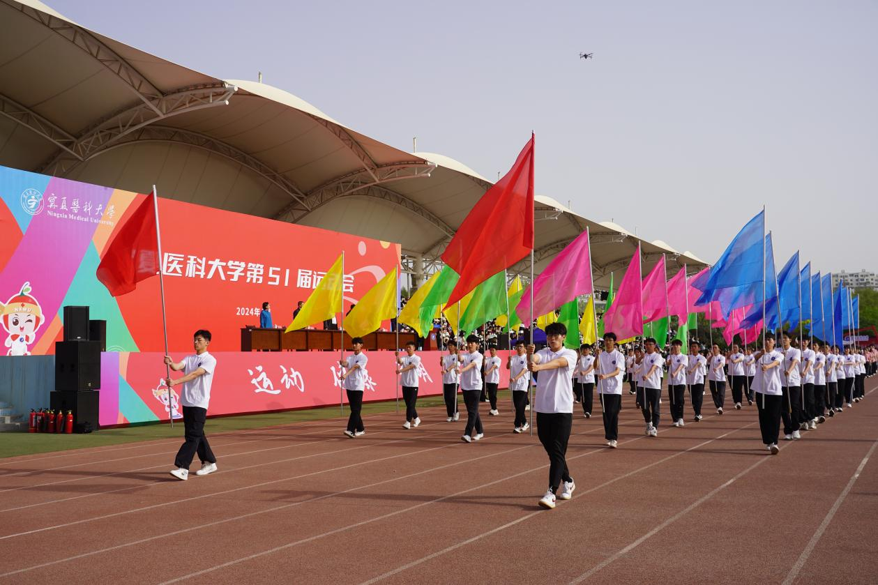 入场式上,伴随着雄壮激昂的运动员进行曲,国旗护卫队,校旗、校徽、彩旗队,各单位运动员代表方队依次入场,他们排着整齐的队伍,朝气蓬勃、昂首阔步、口号铿锵、意气风发地走在运动场上。在庄严的升国旗仪式中,全体师生员工肃立齐唱国歌,注视着五星红旗冉冉升起,每一道声音都是青春的宣言,汇聚着炽烈的力量。在方阵表演中,第一临床医学院学生带来的歌舞表演《青春至上》,以灵动的音符、曼妙的舞姿,彰显了宁医学子活力四射的青春之美;公共卫生学院学生在《青蓝之间》中演绎出生命旋律和运动之美;口腔医学院和检验学院学生在《石榴花开耀宁医》的欢乐乐曲中唱响各民族团结和谐之美,绘就出各民族像石榴籽一样紧紧抱在一起相亲相爱、团结进步的美好未来。