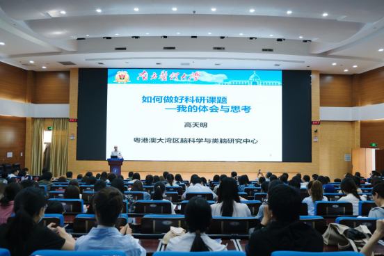 高天明,南方医科大学基础医学院教授、粤港澳大湾区脑科学与类脑研究中心主任,长期从事抗抑郁/焦虑的基础和转化研究。大讲堂上,他以抑郁症研究为例,从选题、提出工作假说、目标设定等8个方面进行了系统阐述,并以“如何做好科研课题——我的体会与思考”为题讲述了团队攻关克难、解决科学问题的方法,同时结合自身经历,分享了多年来在科研中的所思、所悟、所感。作为一位研究“不快乐”的院士,高天明的快乐源于科研上的新发现。他说,搞科研不能急功近利,年轻人要潜心做好基础研究。鼓励青年学者和学生,对自己的科研任务保持热情,用科学的态度和方法继续在自己的科研土壤上精耕细作,勇于担当科技兴国的责任,积极投身于科研工作。