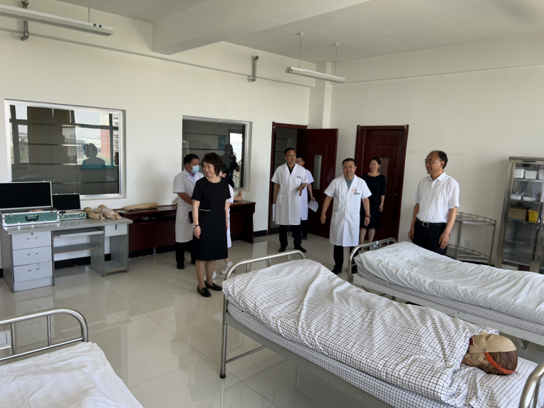 在附属石嘴山市第一人民医院,李银山一行在听取了医院院长周翔鱼关于教学工作开展情况的汇报后讲到,医院作为学校非直属附属医院,承担着大学本科实习生后期临床实践教学内容和见习学生课堂教学任务,积累了很多好的教育教学经验方法,医院教学工作及医教研协同发展方面取得了很好的成绩。希望医院总结提炼教育教学的经验做法,以学校本次本科教育教学审核评估工作为契机,进一步打造高质量教学工作水平,争取创建研究生培养基地建设,实现医院高质量发展。期间,李银山一行还走访了医院智慧党建会议室、院史馆、康复医学科、临床技能中心、OSCE考试中心和学生宿舍,看望在院实习、见习学生并进行座谈交流。