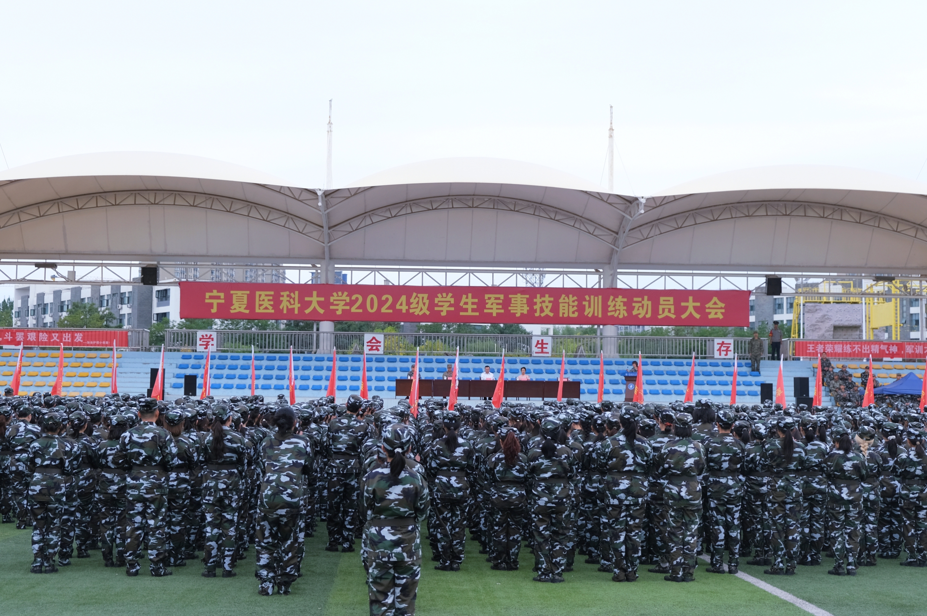 丁聃作军训动员讲话,代表全校师生向宁夏军区对学校军训工作给予的大力支持表示感谢。他指出,军事技能训练是全面贯彻党的教育方针、新时代军事战略方针和总体国家安全观,落实立德树人根本任务和强军目标的根本要求,是普通高等学校学生的必修课程,是大学生活的重要组成部分。全体参训学生要强化国防意识,履行国防义务,承担国防责任,满怀民族自豪感和爱国热情,将国家的安全和利益放在首位。要自觉接受严格管理和艰苦训练,锤炼优良品格,培育“英勇顽强、敢打必胜、忠诚守节、严守纪律”的中国军人精神,展现宁医青年自信自强、昂扬向上的精神风貌。要严格组织纪律,一切行动听指挥,以军人的标准严格要求自己,真准备、真训练、练真功,确保军训“不变形、不变味、不变色”。各单位要高度重视军训工作,加强组织保障,切实关注参训学生的身心健康。积极营造“团结、紧张、严肃、活泼”的集体氛围,以威武的英姿,高昂的斗志,展现当代青年学生的精神风貌,向“大学第一课”交上一份优异的答卷。