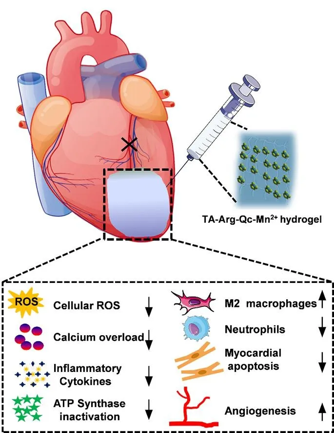 该研究选择了四种不同功能的药物(具有抗氧化作用的硫辛酸、具有抗炎和抗氧化作用的槲皮素、具有促血管生成作用的精氨酸和具有成像功能的锰)构建了四合一可注射水凝胶(硫辛酸-精氨酸-槲皮素-Mn)通过化学键合和超分子相互作用。硫辛酸通过开环聚合反应聚合成主链含有二硫键的氧化还原敏感可降解聚合物——聚硫辛酸。槲皮素通过硫基自由基-多酚迈克尔加成与聚硫辛酸分子的主链缀合。精氨酸通过氢键交联聚硫辛酸分子的羧基侧链。Mn通过离子键进一步交联聚硫辛酸分子的羧基侧链。该水凝胶具有抗氧化特性,促进新生血管形成,抑制炎症,改善细胞内Ca超载和线粒体功能障碍,保护腺苷三磷酸酶(ATPase)活性,维持细胞内能量供应,可以减少心肌梗塞面积,改善心脏功能。这种利用天然药物制备一体化多功能水凝胶的构建方法将为心肌修复提供新的治疗策略。