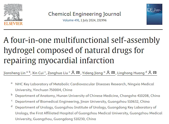 图:一种用于修复心肌梗塞的天然药物四合一多功能自组装水凝胶