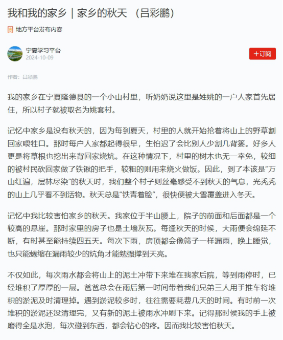近日,学校人文与管理学院2022级研究生4班吕彩鹏同学的征文《家乡的秋天》被“学习强国”宁夏学习平台选登,征文以家乡秋天的变化为视角,纸笔传情,通过细腻的笔触和质朴的文字娓娓讲述了党的十八大以来家乡在居民生活、居住条件、生态环境等各方面发生的翻天覆地的变化,通过“小家”“小村”的变化历程展现了我国“精准扶贫”取得的巨大成果和辉煌成就。