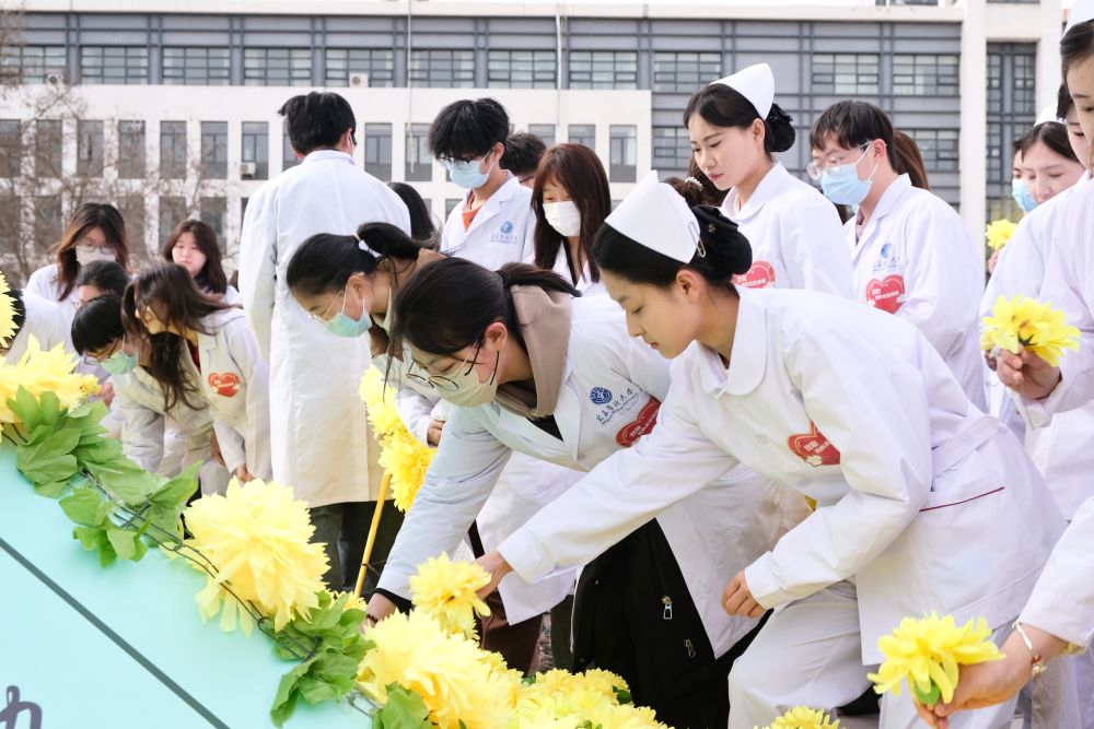清明节前夕,千余名师生身着白大褂、胸前别着黄菊花,在伟德国际1946源于英国雁湖校区生命之柱广场上致敬“无言良师”,共同传承奉献精神。