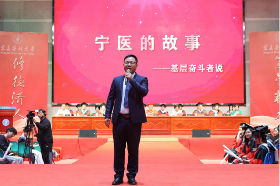 师生合唱环节将气氛推向高潮,大家用歌声传递不舍与祝福,唱出对未来的憧憬与期待。在“宁医的故事——基层奋斗者说” 特别环节,2010级临床医学专业校友、固原市原州区三营中心卫生院副院长扈鹏高走上舞台,目光坚定而饱含热忱,他以自身扎根基层、服务群众的奋斗历程为引,向学弟学妹们深情讲述了那些在偏远地区与患者朝夕相处的日子,那些克服重重困难坚守岗位的时光,无不诉说着个人与国家命运相连的深刻内涵。他鼓励同学们,要勇立时代潮头,把个人奋斗的“小目标”融入国家发展的“大蓝图”,在乡村振兴、基层医疗等祖国最需要的地方,挥洒青春汗水,让青春之花绽放出最绚丽的光彩。