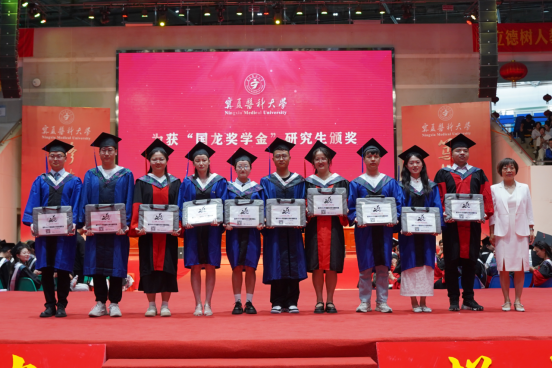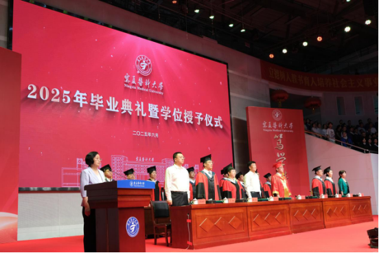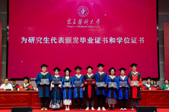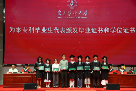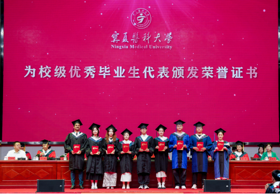 典礼上,宣读了2025届毕业生学历、学位授予情况以及2025年校级优秀毕业生表彰决定。在热烈的掌声中,学校领导先后为本科毕业生代表、研究生毕业生代表和校级优秀毕业生代表颁发毕业证书和学位证书,这一张张证书承载着毕业生们多年的努力与汗水,也标志着他们人生新征程的开启。宁夏国龙慈善基金会执行理事长兼秘书长董旭辉为获得“国龙奖学金”的2025届研究生颁奖,激励同学们在医学道路上不断拼搏进取,做出自己的贡献。