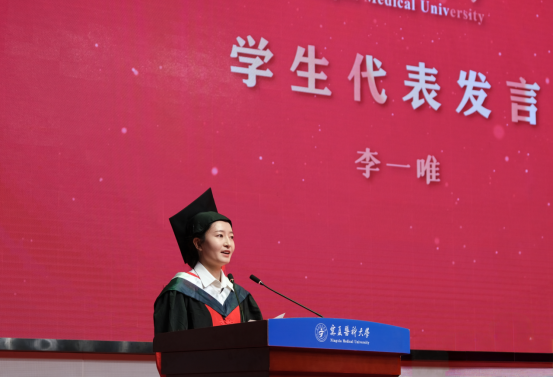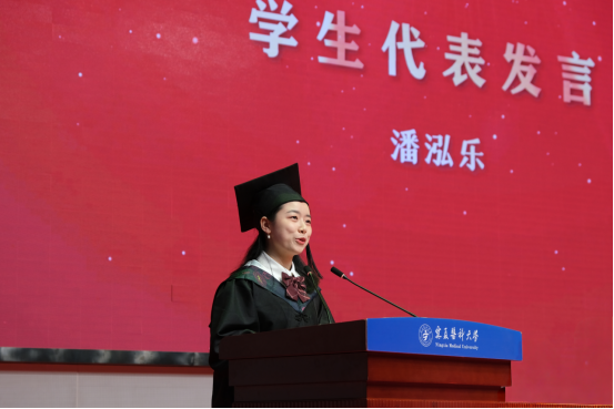 姜怡邓教授代表学校向圆满完成学业、即将扬帆远航的全体毕业生表示热烈祝贺,向悉心指导的师长、辛勤培育的家长致以崇高敬意。站在2025年毕业季的时光坐标上,他与2025届学子共同回顾了他们用多元成就续写的医者荣光,当繁星般的成长故事汇聚成河,便勾勒出宁医人"修德济人、笃学精术"的精神群像 —— 愿2025 届学子带着这份与时代同行的答卷,让青春在祖国最需要的地方绽放成璀璨星河!