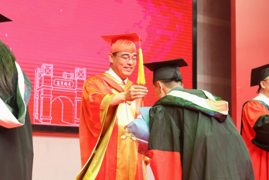 姜怡邓与学术委员会委员代表们共同为获得学位的研究生拨穗流苏