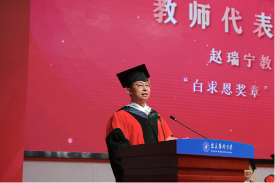 自治区首位“白求恩奖章”获得者、第三临床医学院副院长赵瑞宁教授,以深厚的专业积淀与丰富的从医经验,为毕业生们带来了饱含智慧与期许的谆谆教诲;基础医学院2025届博士研究生李一唯,结合自身科研求学之路,分享探索真知的感悟;口腔医(学)院2025 届毕业生潘泓乐,以青春视角讲述校园成长故事,向母校和师长表达真挚感恩。他们的话语,或沉稳有力,或真挚动人,引发在场师生的强烈共鸣。