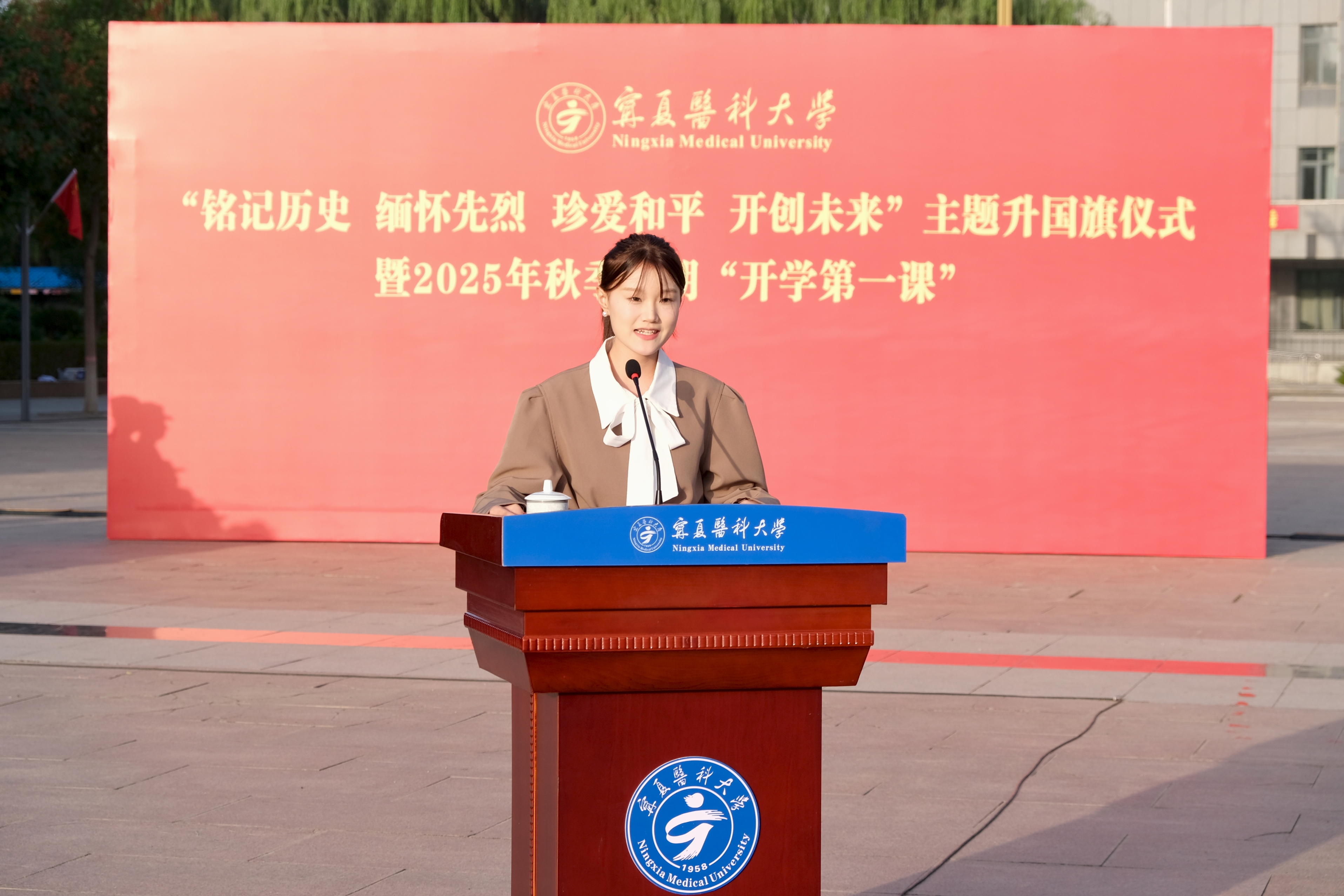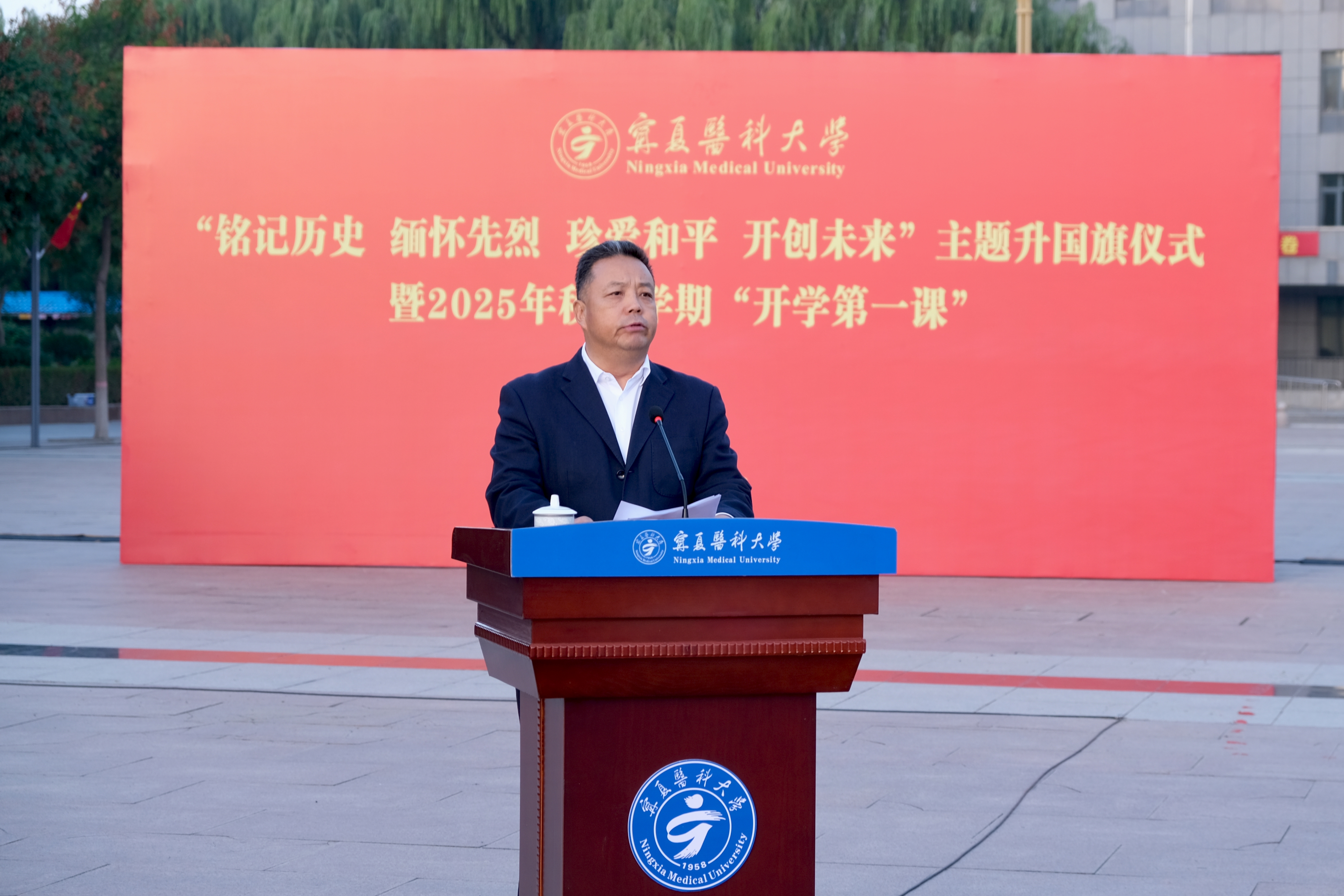 张治荣以“铭记历史,缅怀先烈,珍爱和平,开创未来”为题讲授开学第一课。他讲到,全体师生要铭记抗战历史,在传承薪火中坚定理想信念,把“爱国”誓言转化为实际行动,在课堂上认真听讲,用知识积蓄报国底气;在实验室刻苦钻研,用创新攻克医学难题;在治病救人中践行担当,用行动诠释“健康所系,性命相托”的铮铮誓言。要传承抗战精神,在勇担使命中谱写青春华章,深刻领会伟大抗战精神的丰富内涵,将所见所得融入成长之路,铭记抗战先辈们的奉献与坚守,让抗战精神成为砥砺前行的不竭动力。要践行时代担当,铸牢中华民族共同体意识,在团结奋斗中书写强国答卷,让校园成为各民族同学团结互助、共同进步的大家庭。