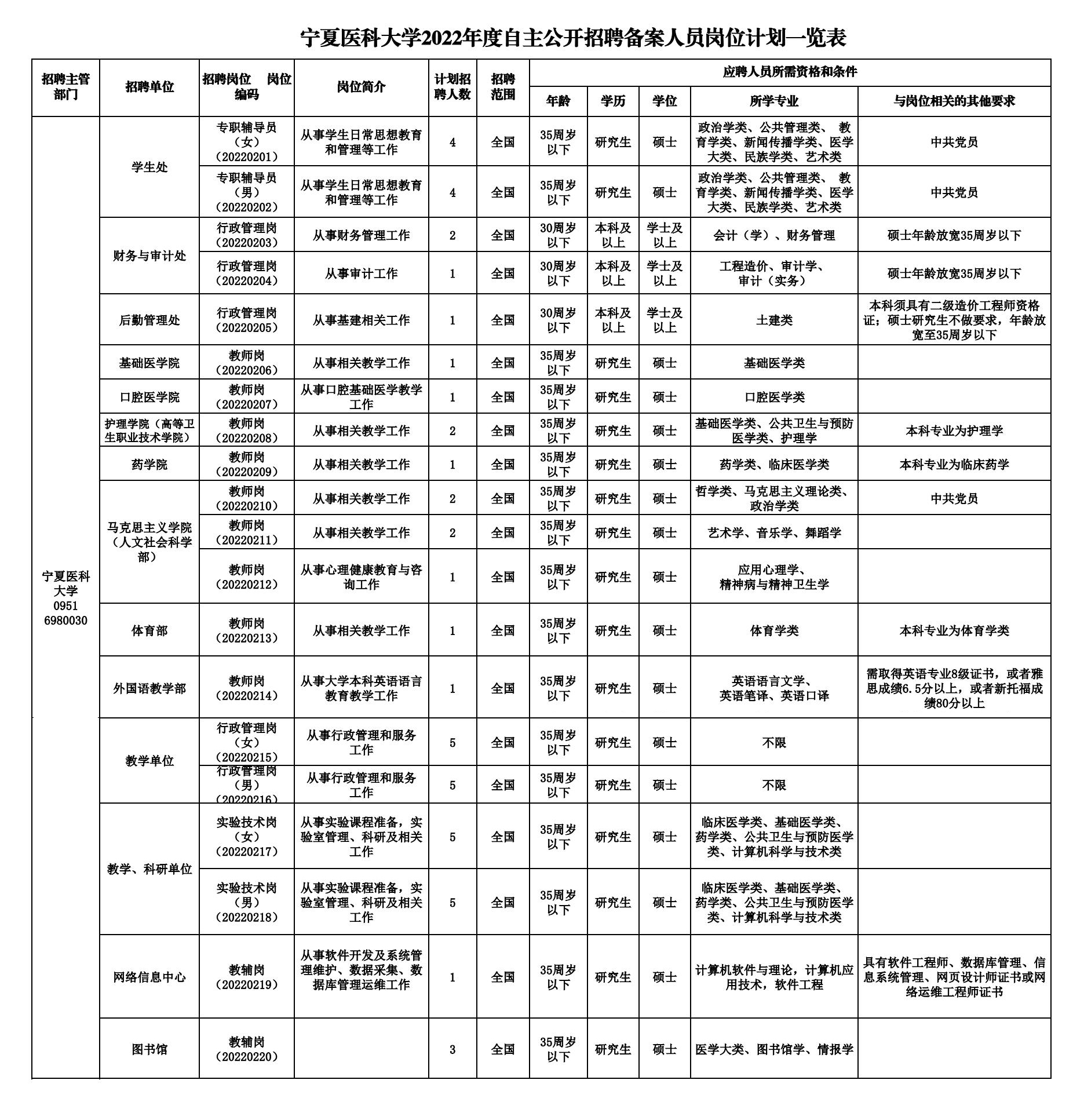 根据《关于高等学校实行人员总量管理试点的意见》(宁党办〔2017〕72号)《关于进一步做好全区事业单位自主公开招聘工作的通知》(宁人社函〔2020〕65号)及《伟德国际1946源于英国备案人员管理办法》(宁医校发〔2020〕21号)相关规定,为进一步推进人员总量管理工作,结合学校实际,现就伟德国际1946源于英国2022年备案人员公开招聘有关事项公告如下: