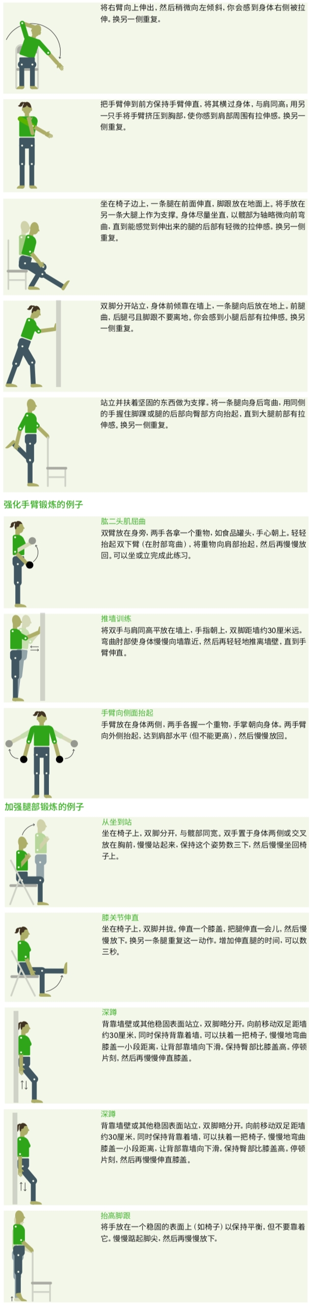 例如:有控制的呼吸练习、温和的步行、拉伸和平衡练习。如果对上述任何活动的RPE值超过1分,就不要在本阶段做这些活动,不超1分就可以做这些活动,也可以坐或站关拉伸肌肉,每一次拉伸轻柔地进行,而且每一次应保持15-20秒。平均心率保持以120次/分钟内。