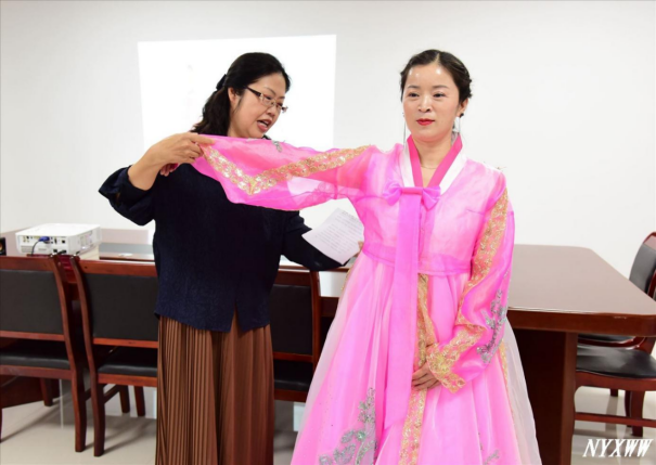 全体教师分为高职组、本科组、研究生组及党支部组,老中青搭对,热情洋溢地展示了回族、纳西族、彝族、藏族、朝鲜族、维吾尔族、壮族、满族、苗族及蒙古族等民族服饰。高职组赵安老师激情澎湃地介绍了回族无沿小圆帽和戴披搭式巾帕服饰,孙璨老师应景地展示了巾帕半遮面颊的娇羞。“藏族服饰肥腰、长袖、大襟、右衽、长裙、编发,典雅潇洒,充满敬意的‘哈达’是藏族同胞的最爱……”本科组王媛老师解说地头头是道。舞袖弓腰,杨昕老师一曲藏族小舞更是点燃了全场热情。研究生组张悦老师头戴“尕巴”小花帽,身穿绣花衣,移颈、翻腕,展现了张虹老师描述的“维吾尔族,是一个爱花的民族”。党支部组孙青老师褒衣博带,舞动的马蹄袖,英姿飒爽,完美呈现了王宁芳老师解读的“蒙古族服饰不仅体现着人体的曲线美,又体现着蒙古牧人宽厚大度、粗犷坦荡的性格”。
