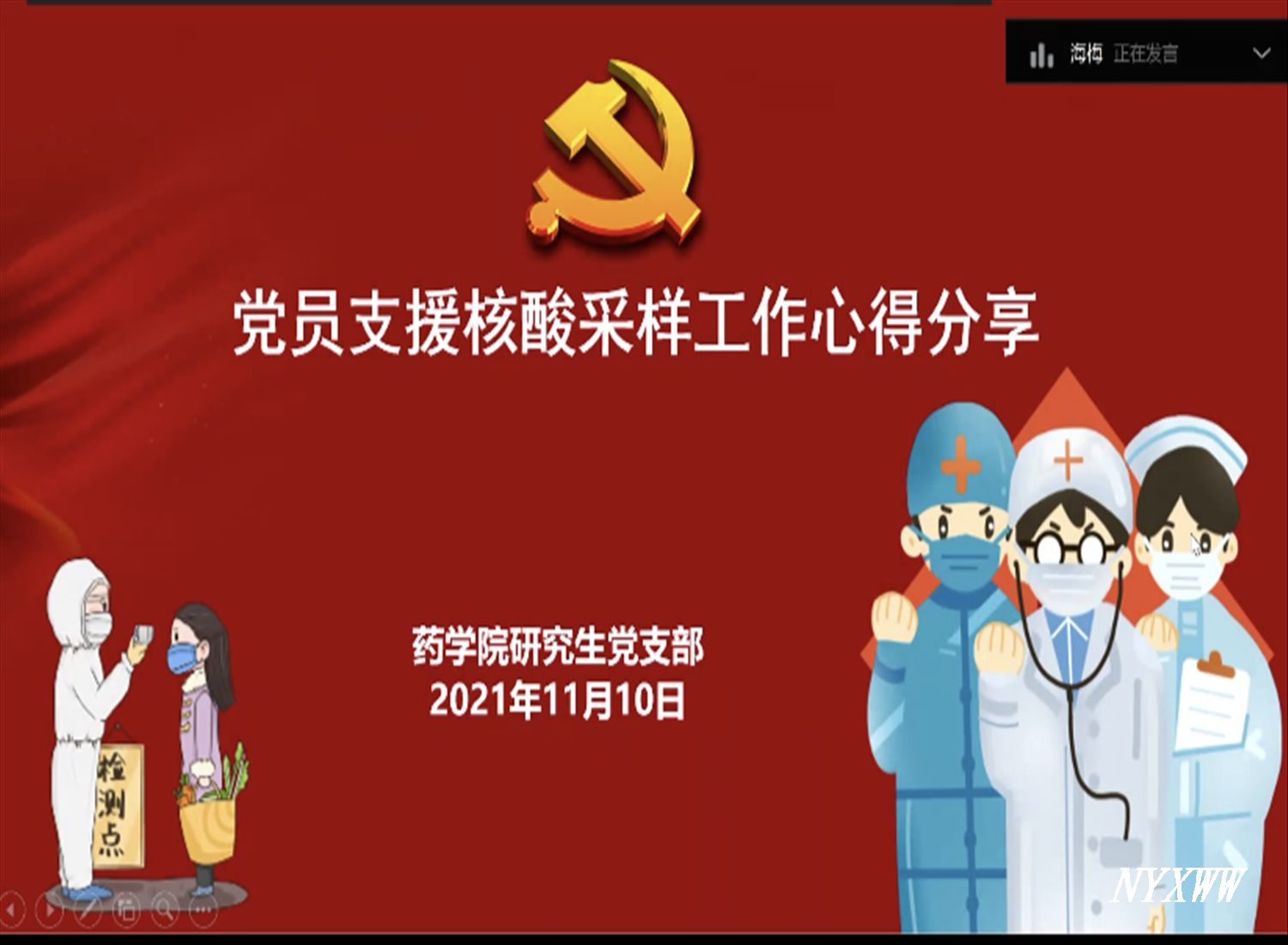 11月9日,药学院公寓党支部在线上举行了“防控疫情从我做起,消防安全与我同行”主题活动。活动中全体人员共同学习防疫知识,观看了防疫宣传片,并在119消防宣传日之际,通过扫码答题自测消防知识漏洞,观看消防安全宣传片。11月10日,药学院研究生党支部在钉钉平台开展“疫情防控见初心,党员先行担使命”主题党日活动,全体党员集体学习了中国共产党第十九届中央委员会第六次全体会议精神,自治区党委书记陈润儿在宁夏回族自治区党委常委会会议暨应对新冠肺炎疫情工作领导小组第20次会议讲话精神,观看“致敬抗疫一线党员”等视频,并积极进行在线讨论和分享。