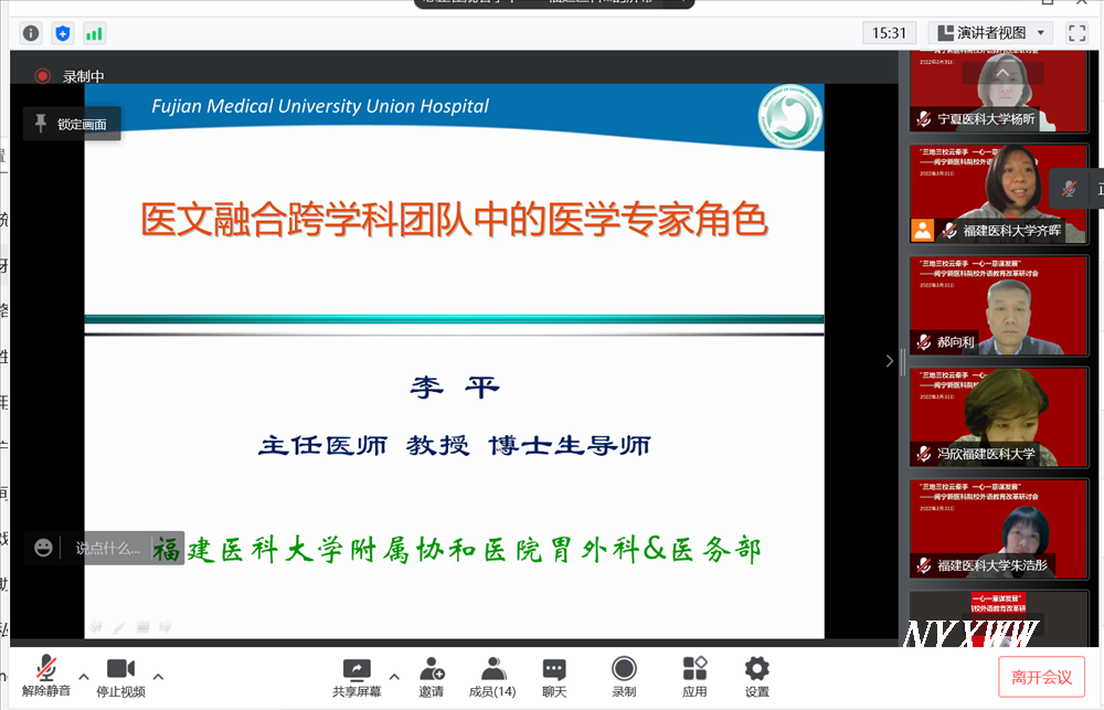 3月31日,外国语教学部主任郝向利、教学办主任杨昕与福建医科大学文理艺术学院、新疆医科大学语言与文化学院欢聚云端,共同参加闽宁新医科院校外语教育改革研讨会,探讨三校共建虚拟教研室的建设方案。