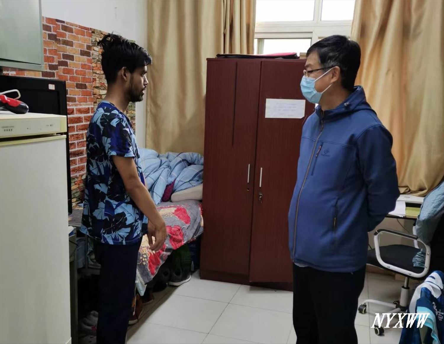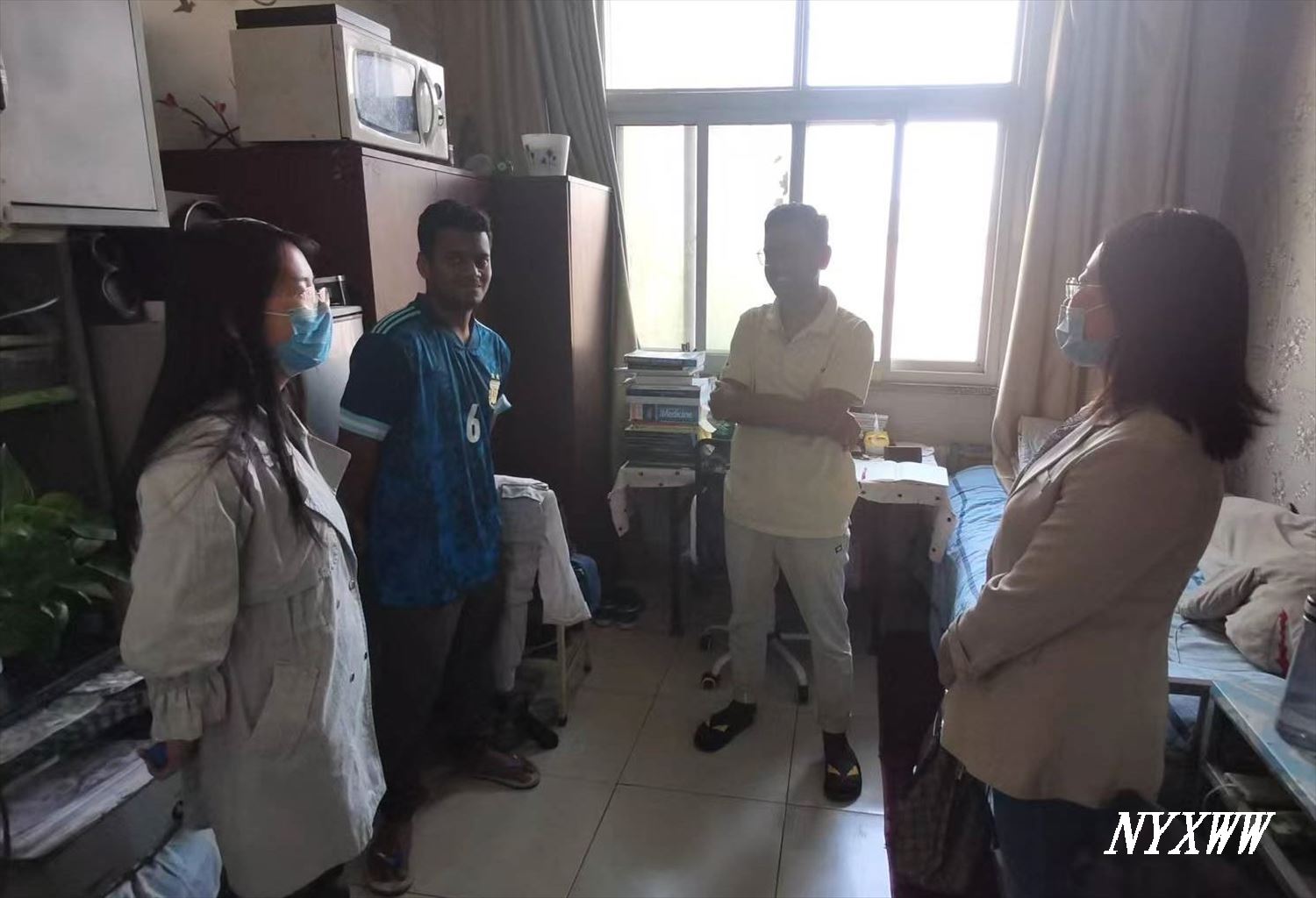 在双怡校区,吴川书记、马昕副院长走进学生宿舍,与留学生们进行了深入交流,深入了解学生们目前的生活、学习和心理情况,推进解决学生的急难愁盼问题,并对目前存在的有关需求,提出了相应的解决方法。同时,详细了解疫情期间学生们的身体健康状态和心理状态,帮助他们进行情绪疏导。随后对学生公寓的公共设施和安全隐患进行排查,督促宿管做到消杀到位,切实保障疫情期间学生们的学习生活安全。