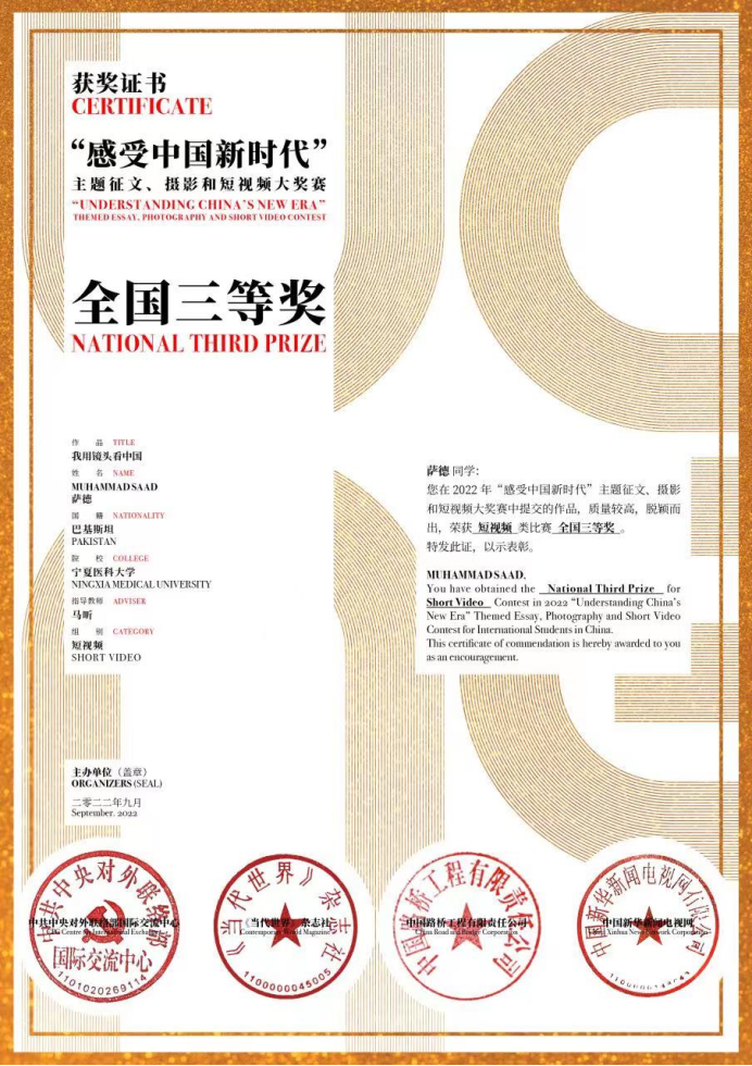 11月22日,在中共中央对外联络部所属《当代世界》杂志社与中国新华新闻电视网、中国路桥工程有限责任公司联合主办的“感受中国新时代”主题征文、摄影和短视频大赛上,伟德坦桑尼亚籍留学生NGENZI RICHARD DJURIST(李秋天)的参赛作品《我的中国学医梦》和巴基斯坦籍留学生MUHAMMAD SAAD(萨德)的参赛作品《我用镜头看中国》荣获短视频比赛三等奖。