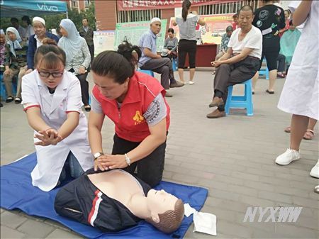 活动当天,服务队专门制作了突发性疾病的类型及预防措施、夏季疾病预防措施、常见药品知识等宣传展架,发放宣传手册和调研问卷300余份。队员们现场免费为社区150余名老人测量血压、义务按摩、发放药品,给予相应的健康指导;还为社区居民和工作人员进行心肺复苏、外伤包扎等急救知识的讲解、示教。活动一经开展,得到了社区居民的良好反响和踊跃参与,平罗电视台进行了采访报道。实践服务结束后,服务队还受邀参观走访了国家直属口五七干校博物馆。