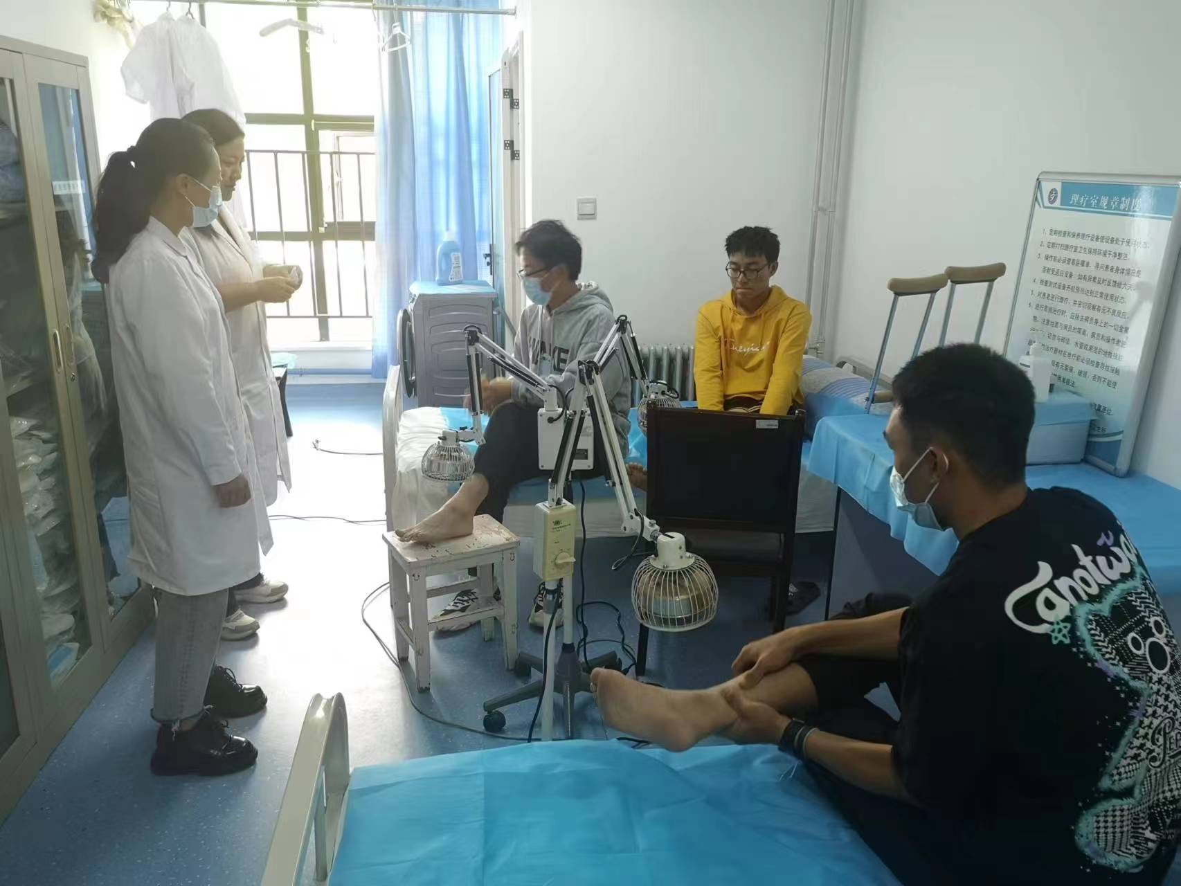 为了让学生在出现突发状况时能及时就医,医护人员晚上轮流值班。作为所长,李晓明忍着膝关节积液的病痛,坚持第一个到岗,亲自安排组织,逐点检查,日夜值守。医生魏丽还有三个月就退休,仍然天天坚守在老校区医疗点。全所医护人员虽然只有6个人,但顶着巨大压力合理安排有限资源,最大限度地服务学生。10多天里,大家吃住在校区,分2组开展全天候服务。他们每天除了接诊近百人次,输液理疗数10人次,还要时常出急诊,值守3个医疗点,储备补充药品物资。两个校区距离较远,他们每天奔波五六个来回,没有一个人叫苦叫累。因为大家只有一个信念,做好服务保障,守护校园安全。