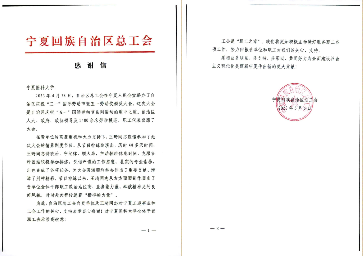在学校党委的高度重视及大力支持下,我院王琦教授在学校开展主题教育期间,主动投入到自治区庆祝“五一”国际劳动节暨五一劳动奖颁奖大会情景剧类节目中,牺牲休息时间,克服各种困难积极参加排练,政治站位高、业务能力强、奉献精神足,自治区总工会向学校发来感谢信,我们向王琦教授学习!