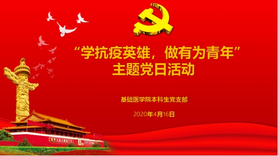 在全民奋力战“疫”时期,为认真贯彻落实习近平总书记关于疫情防控重要指示精神,进一步激励党员干部担当作为,保证党支部学习不掉线,党员学习在“疫”线。4月16日,基础医学院本科生党支部通过钉钉视频会议平台以“学抗疫英雄,做有为青年”为主题开展了一场别开生面的线上主题党日活动。活动由支部宣传委员景亚男同志组织并主持。