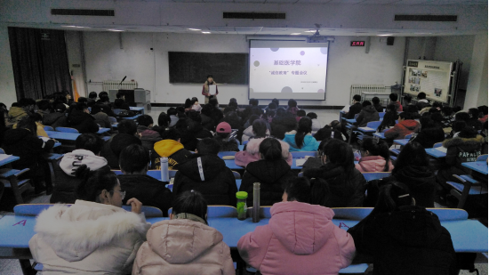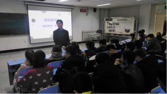 随着期末考试临近,为了杜绝作弊现象的发生,加强同学们的诚信观念,基础医学院于12月21日早晨在厚生楼101教室举行了以“诚信教育”为主题的讲座,基础医学院党委副书记马立虎、辅导员杨兴莲出席了本次活动,全院本科生参加此次讲座。