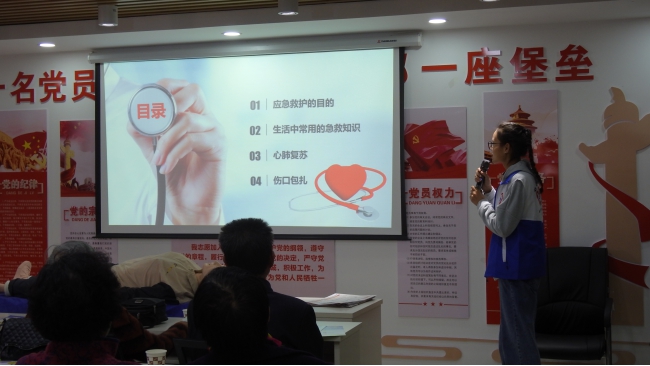 2018级博士研究生董灵悌为社区居民开展了“科学护肤 警惕早癌”的皮肤病相关知识。通过讲解,使社区居民可以关注到平常生活中皮肤出现的一些问题,及时预防,及早治疗。随后由学院急救培训人员为社区居民讲解了生活中中暑、扭伤、火灾等常见突发事件的应急处理方法,演示了心肺复苏、手部包扎、腕部包扎等急救措施。通过知识普及、互动参与学习,使社区居民对急救知识和技能有了一定程度的了解。最后,由丁万聪给大家讲解了垃圾分类知识和酵素制作。习近平总书记说“垃圾分类就是新时尚!”面对我国垃圾的现状,我们应该大力提倡垃圾分类,争做环保使者,共创绿色文明。