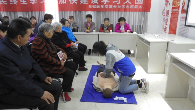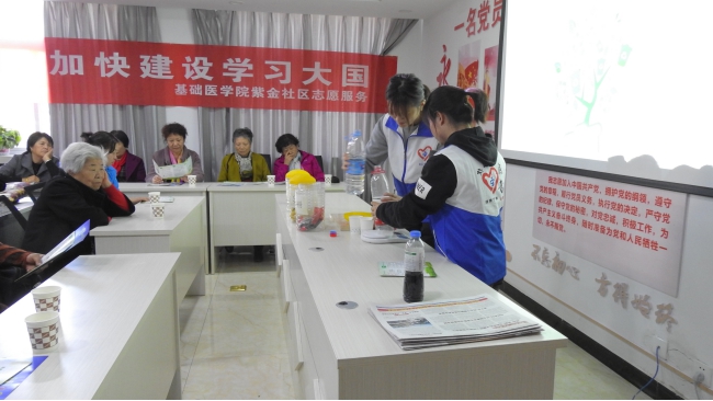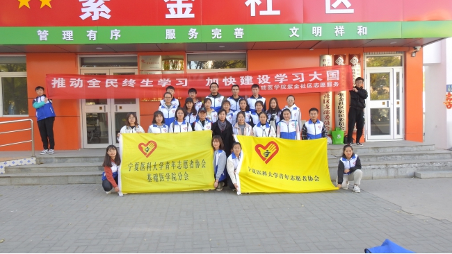 为深入学习贯彻习近平总书记在全国教育大会的讲话精神,全面落实党的十九大提出的“办好继续教育,加快建设学习型社会,大力提高国民素质"新要求,基础医学院青年志愿者协会联合校青年志愿者协会共30名志愿者于10月30日到胜利街紫金社区,为社区居民开展“推动全民终生学习,加快建设学习大国”为主题的志愿服务活动。