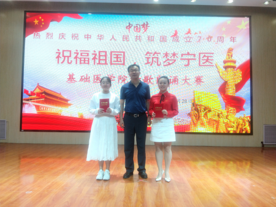 由54名同学组成的13支参赛队伍依次登台朗诵,选手们精神饱满、感情充沛,以满腔的热情表达了对祖国母亲70华诞的祝福和歌颂,充分展现了他们的普通话功底,抒发了浓浓的爱国之情。《我和我的祖国》、《我爱十月》、《传奇中国》、《新生的祖国》等朗诵篇章讲述了新中国在艰难之中的不断崛起,共产党带领人民从站起来到富起来到强起来的历史传奇。2019级研究生汤业珍等4人带来的原创作品《祝福祖国 圆梦宁医》更是真情实意的表达了对祖国母亲美好的祝愿。“弹唱着今日辉煌的旋律,七十载风雨兼程,我们一直都在路上”;“祝我祖国,繁荣昌盛;愿我宁医,桃李芬芳。”表达了宁医人不忘初心,牢记使命,奋进新时代,建设新宁医的决心。
