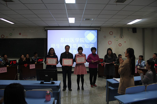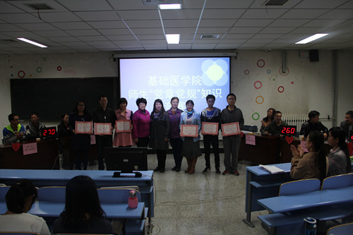 竞赛以现场互动环节拉开帷幕,主持人通过现场提问的形式,与观众互动,气氛热烈,师生兴趣浓厚,共同重温了党章党规及长征知识。随后六支参赛队伍分别通过个人必答题、集体必答题、抢答题,风险题和加时赛等环节进行了激烈角逐。最终,学生第一党支部获得一等奖,院党委和学生第二党支部获得二等奖,教工化学生理病理党支部,教工生理解剖组胚党支部和学生第三党支部获得三等奖。
