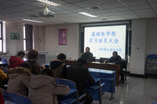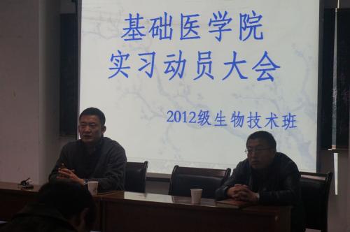 2015年12月10日上午,基础医学院2012级生物技术专业学生实习动员大会在厚重楼201教室召开。学院党委书记周永伟、学院教学办公室主任张鸣号和2012级生物技术专业全体本科生参加了此次动员大会。