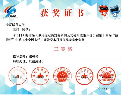 11月16日至21日,第十四届“挑战杯”全国大学生课外学术科技作品竞赛决赛在广东工业大学拉开帷幕,经过激烈角逐,由我院张鸣号老师指导的作品《多用途记滴器的研制及其使用效果评价》获全国三等奖,张鸣号老师本人被评为“优秀指导教师”。