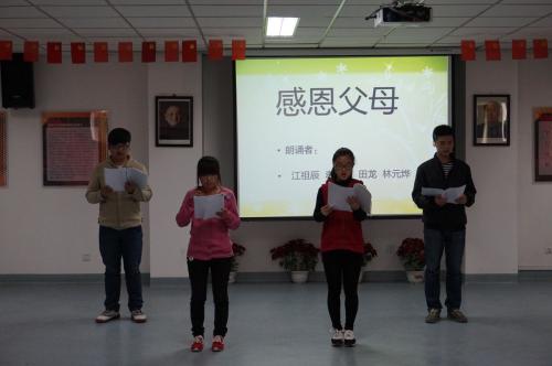 随着舒缓的音乐,主持人缓缓走上舞台,简单介绍评分规则后,第一组参赛队员走上舞台,随着音乐和朗诵的节奏变换着队形,“感恩是一种力量,感恩是一种境界,拥有一颗感恩的心,我们就会拥有快乐,拥有幸福,拥有一个美好的未来······”接下来的一组队员用自己特有的风格演绎着自己对感恩的诠释,这组队员整齐的着白色T恤、黑色短裙走向舞台,声情并茂的诠释着对父母的感恩:“爸爸是太阳奉献了浑身的力量,妈妈是油灯耗尽了毕生的心血······”朗诵激起了全场同学的共鸣,掌声久久不息。经过激烈的角逐,最终评出一等奖1项、二等奖1项、三等奖1项,和优秀奖1项。