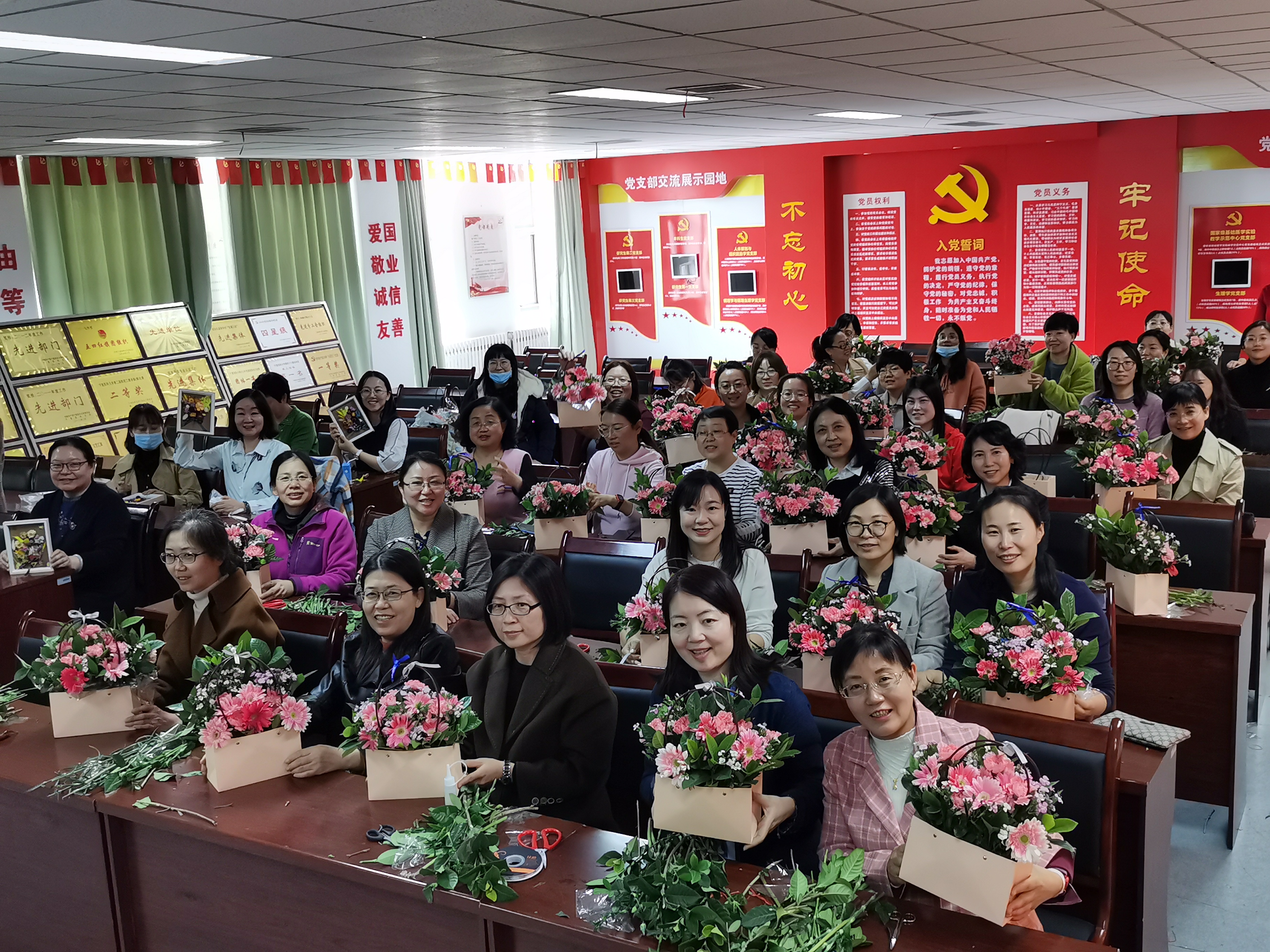 2021年3月8日下午组织女职工观看电影《你好,李焕英》。3月10日中午组织女职工开展“与花共舞,绽放美丽”插花制作活动。在专业插花师的悉心指导下,女老师们用自己灵巧的双手,尽情发挥想象力、创造力,整合造型,修剪枝叶,使得原本普普通通的花草经她们的巧手摆插后,错落有致地搭配在了一起,插出了漂亮美丽的花篮,陶冶了身心健康,增添了节日气氛。