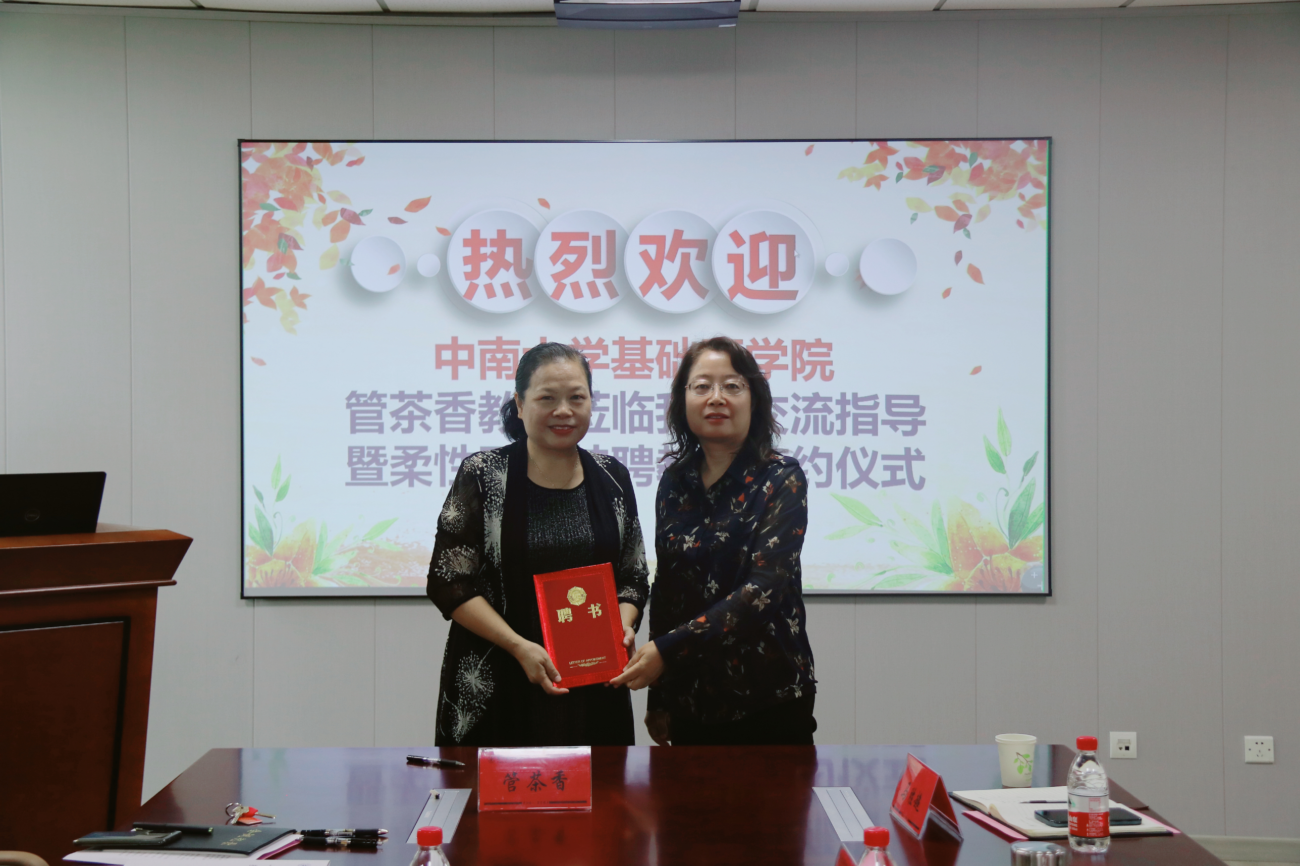 刘娟院长介绍了学院基本情况并与管茶香教授签订柔性引进特聘专家协议书,郝银菊副校长为管教授颁发聘书。