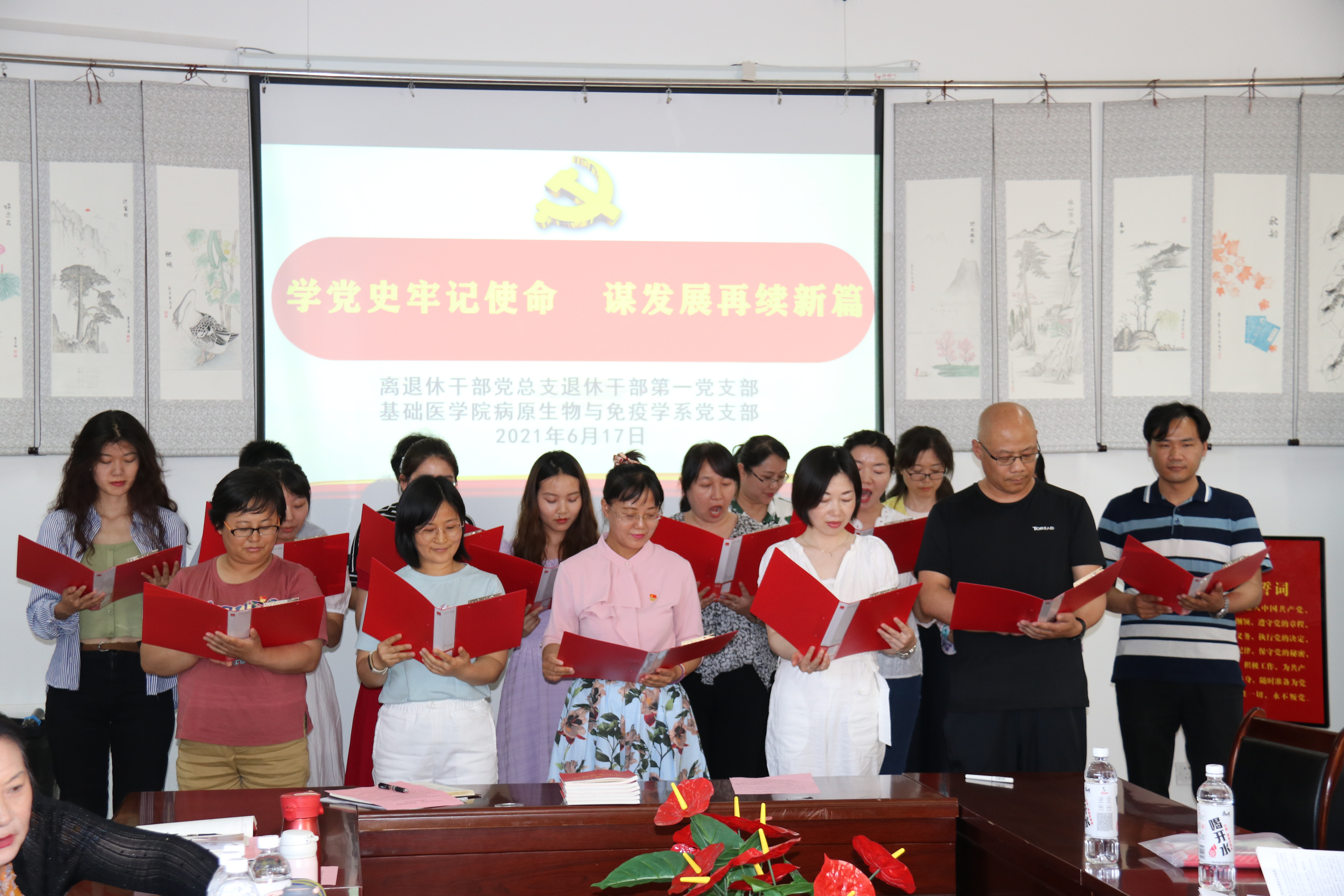 为隆重纪念党的100周年华诞,2021年6月17日下午,病原生物学与医学免疫学系党支部和退休干部第一党支部在双怡校区老年活动中心联合开展“学党史牢记使命 谋发展再续新篇”主题党日活动,学校党史学习教育第三巡回指导组组长、学校纪委书记、监察专员谢波同志、离退休干部党总支书记丁玲同志、基础医学院病原生物与免疫学系党支部教师和研究生党员及学系群众教师和民主党派教师, 离退休干部各党支部书记、退休干部第一党支部党员等50余人参加了活动。