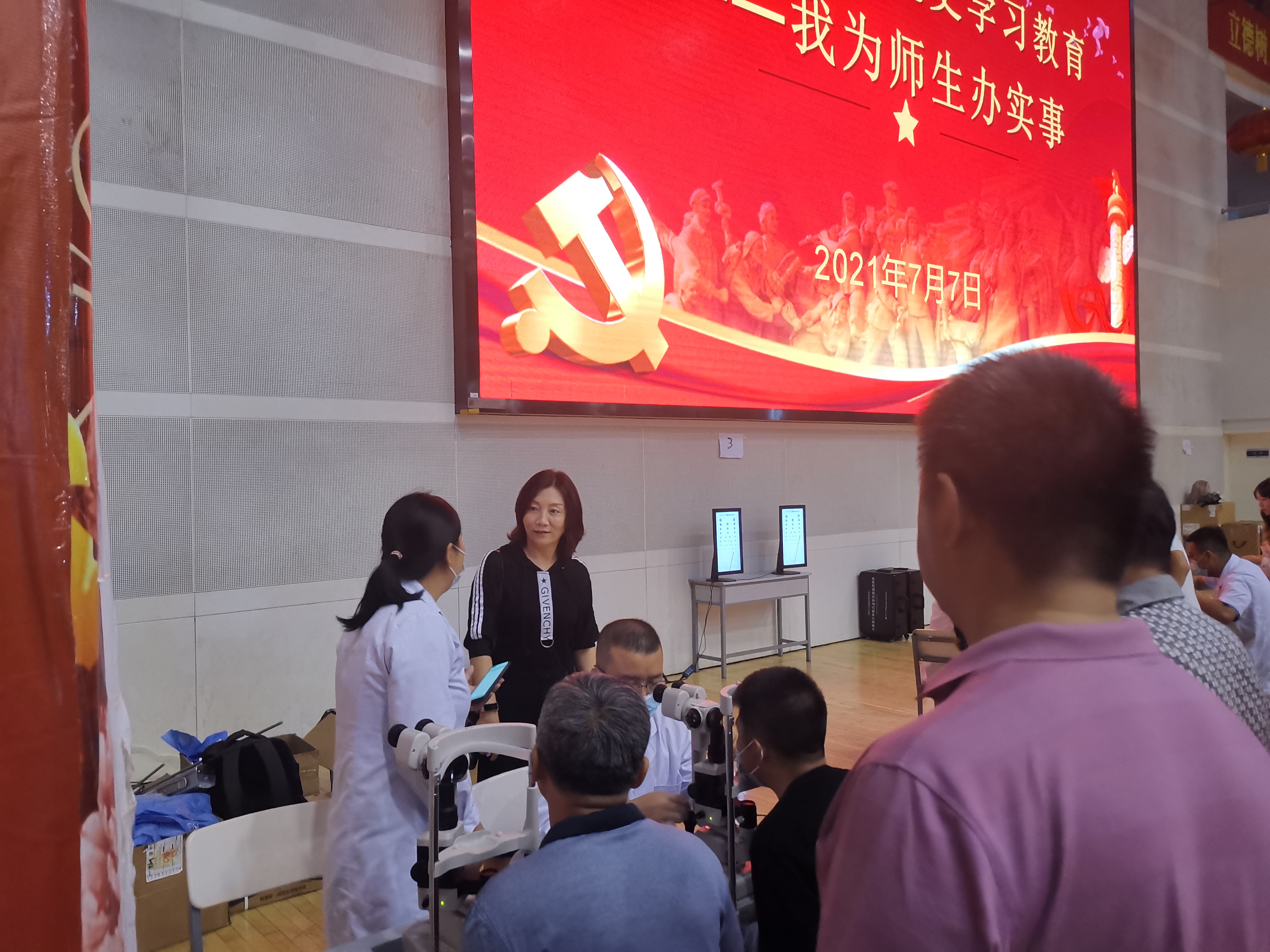 为深入开展党史学习教育,认真落实“学党史、悟思想、办实事、开新局”的目标要求,在庆祝建党百年华诞之际,7月7日—9日,基础医学院和宁夏眼科医院联合在学校弘毅体育馆开展“我为群众办实事”——眼科疾病筛查活动。活动由体育部协办,宁夏眼科医院专家团队携带眼科专业检查设备为师生开展义诊,旨在帮助师生进行眼科疾病筛查,增强师生爱眼护眼意识。为配合此次活动开展,6月4日在第26个“爱眼日”,宁夏眼科医院专家团队来校为师生开展了“关注眼健康”专题讲座。